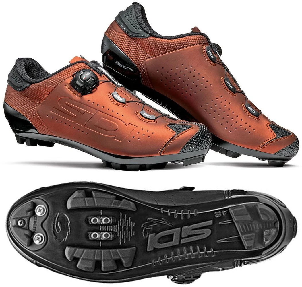 Nylon sole with non-slip plastic inserts. The sole was specially developed for mountain biking and offers extremely good grip, high stability and prevents mud from sticking. The SIDI logo in the middle of the sole provides optimal traction and more safety when getting on the pedal. The RS17 combines extremely high pedalling stiffness with the necessary flexibility in running passages. With interchangeable tread insert in the toe area and additional inserts for optional cleats.