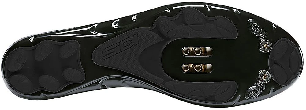 Carbon fibre reinforced nylon sole with integrated plastic inserts for optimum traction when walking. Compatible with all common MTB pedal systems.